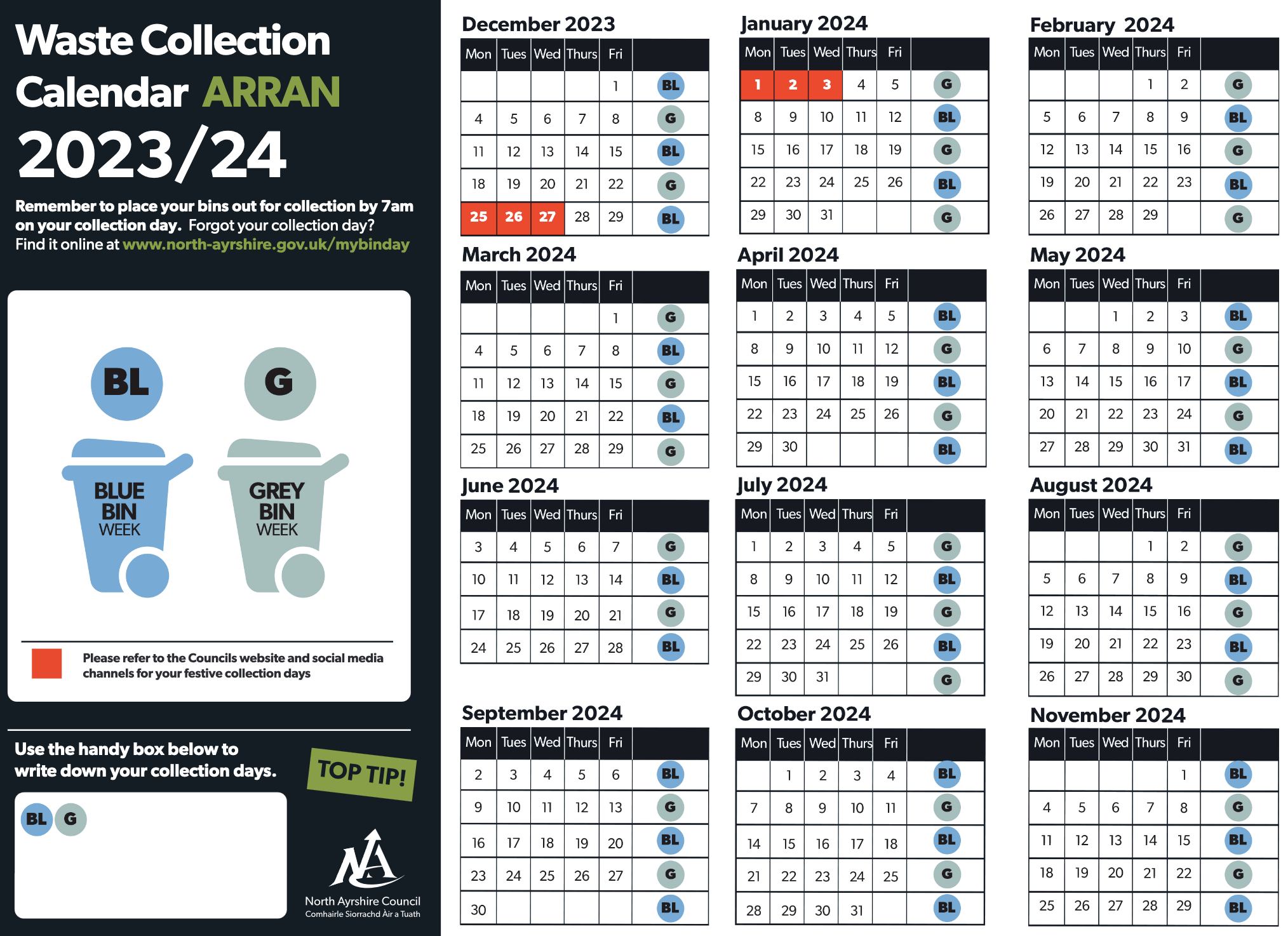 Below is the calendar for the Arran bin collection. Please also see the North Ayrshire website for more details