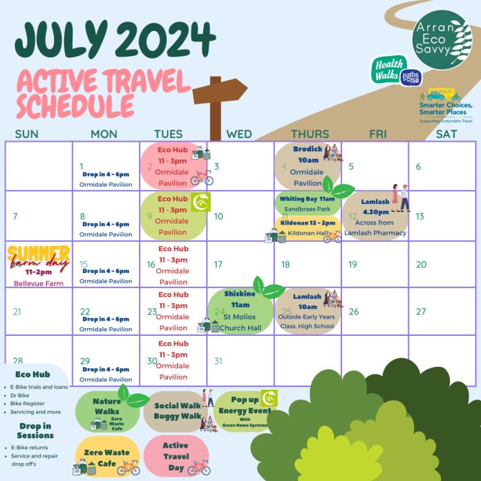 The Zero Waste Cafe has got loads going on with some exciting cafes and an outdoor cooking workshop at Brodick Castle. It is also popping up in Brodick and Kildonan. The team is also helping to organise the Summer Farm Day at Bellevue Farm, which will be a brilliant day out for all the family! The Active Travel Team will be at some cafes with some E-Bikes for people to try out and their snazzy bike decoration stations.