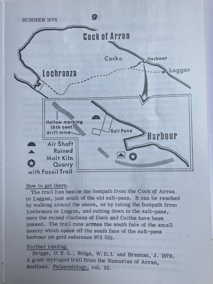 With the exciting news of a UNESCO Geopark delegation visiting Arran over the last few days, here is a piece from The Arran Naturalist (Issue 1, summer 1978) on the Arthropleura Trail in the North of Arran, a fossilized set of footprints which can be found a little further round the coastline from Hutton’s Unconformity, near Laggan. The Arthropleura was a giant centipede that lived around 300 million years ago and grew up to 2m, making it the largest invertebrate to have ever lived on land.