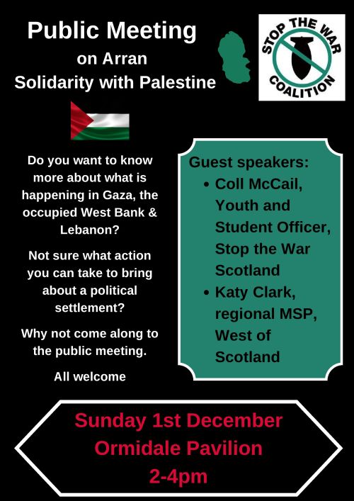 The purpose of the meeting is to share information about the current conflict and to discuss setting up a local group to organise activities on Arran. There will be two guest speakers at the meeting.