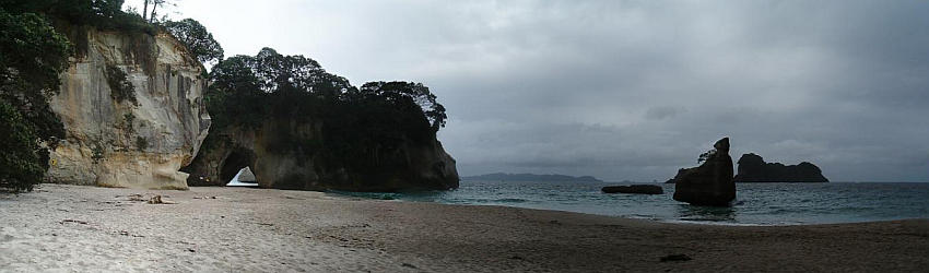 After a few days of R & R in Tauranga we set off to the Coromandel Peninsula. Again, taking advantage of a “three nights for the price of two” offer we stayed in a very nice motel in Hahei. The next morning, a short drive and a 45 minute walk took us to Te Whanganui-A-Hei or Cathedral Cove. Those of you who have seen the Narnia film Prince Caspian will recognise it as the opening location shot. Although the cove receives around 150,000 visitors a year we were the only ones there and had the beach to ourselves. Unfortunately the tide was up so we couldn’t walk right through the arch.