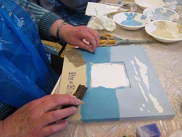 Our crafternoon, ‘Mirrors for Mind’ involved us learning mixed media techniques to decorate a mirror to take home with us. We offered three different themes but in the end the ‘vintage’ and the ‘seashore’ themes were the preferred choice for members. We painted, cut, glued and stamped our way through the afternoon while attempting to tackle a mountain of cake generously donated by group members. Each member had their own craft box of resources and access to a huge range of additional inspirational resources on each table.