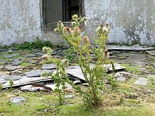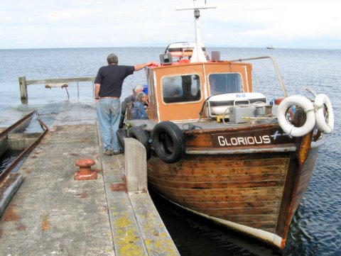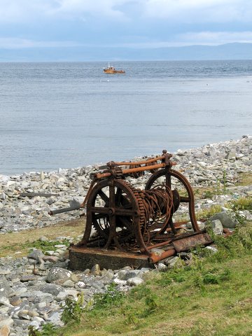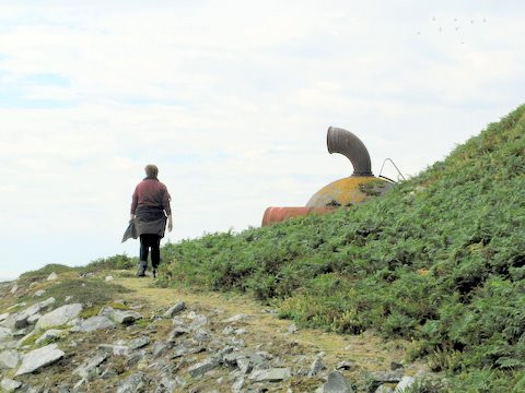 After a picnic lunch outside what used to be the dwelling-house, some people tackled the steep climb up to the fort on the hill, built in the 14th century from a small quantity of sandstone found among the granite. The less energetic walked along the shore, making for the astonishing foghorn built to warn shipping of the hazard that the island presented. Housed in a kind of small temple, its massive curved horn still stares out to sea, silent now, through its bellow could be heard from miles away. It worked, amazingly, on compressed air. Most of the pipes have rusted away, but the mechanism can still be seen. Had the little colony managed to last out a few more years, until the advent of the Internet and easy communication, they might still be there to this day. At that time, human physical ability was their only asset, and the deaths of men whose strength and skill were essential to that way of life brought it to an end. We looked back across the wake of the returning boat with some regret, for the rocky island remains a strangely tranquil place, brooking no argument but secure in its intrinsic strength.