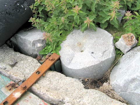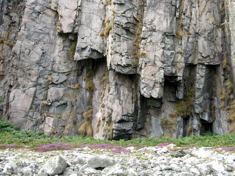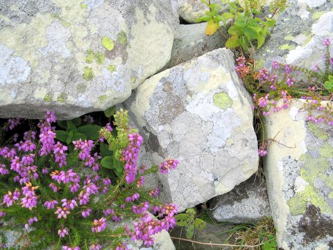 Completing the anti-clockwise circuit, we came back to the landing stage and ignored its severe notices warning that any persons setting foot on it did so at their own risk. The sun shining and the grass was full of flowers and rabbit droppings and sometimes the bones of the birds that live and die there. Dotted about forlornly were the abandoned artefacts left from the days when a colony of people lived there – a stone bread oven, a winch, the remains of an engine, a derelict gas stove with foxgloves growing beside it. There used to be a living on the Craig, when people hewed the fine granite for the making of Scotland’s best curling stones. They’d built a narrow tramway to carry the hefty blocks from the quarry place to the quay, and had a donkey to help with traction. The eroded sleepers are still in place, and sometimes the rails, with a set of points where the line branched. There was a haulage system in place, with pulley wheels to stop the rope chafing against rocks. A baby slow-worm, temporarily held in place under a walking boot, slid smoothly away when released, not by the head-then-tail method that true worms use, but moving all over, like the khaki-golden legless lizard that it is. Every stone is covered in glorious patching of turquoise-grey and lemon-yellow lichen, half-buried in heather and abundant mosses.