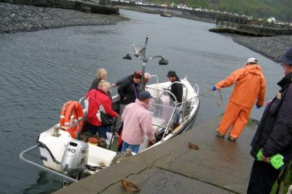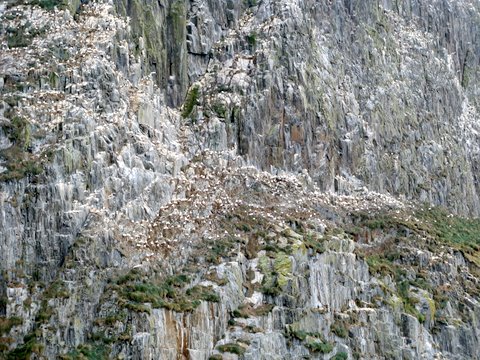 On the wet morning of August 4th, ten people, mostly from Corrie, drove down to Girvan and went on a fishing boat to Ailsa Craig, that sugar-loaf-shaped island that stands out of the sea beyond Pladda. The boat’s owner was out to check his lobster creels, but he obligingly circled the Craig so that we could see the thousands – perhaps millions – of gannets that nest on the northern cliffs of the steep island. There were so many that they looked like colonies of white flowers decorating the astonishing natural architecture of the rocky columns and gulleys. As David Underdown said with poetic insight, ‘It looks like some Victorian fountain table feature.’ Frozen sugar-guano, arrested in mid-flow. More frivolously, a flight of puffins rushed ahead of the boat, their little wings working overtime.